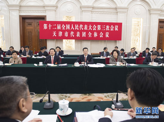 3月6日,中共中央政治局常委、国务院副总理张高丽参加十二届全国人大三次会议天津代表团的审议。 新华社记者王晔摄
