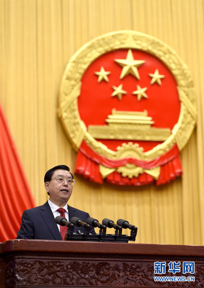 3月8日,十二届全国人大三次会议在北京人民大会堂举行第二次全体会议。全国人大常委会委员长张德江作全国人民代表大会常务委员会工作报告。新华社记者 谢环驰 摄