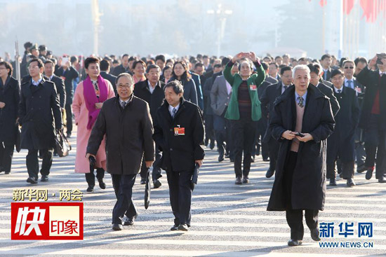 3月10日,全国政协十二届三次会议在北京人民大会堂举行第三次全体会议。这是全国政协委员抵达天安门广场。新华社记者 吕迅 摄