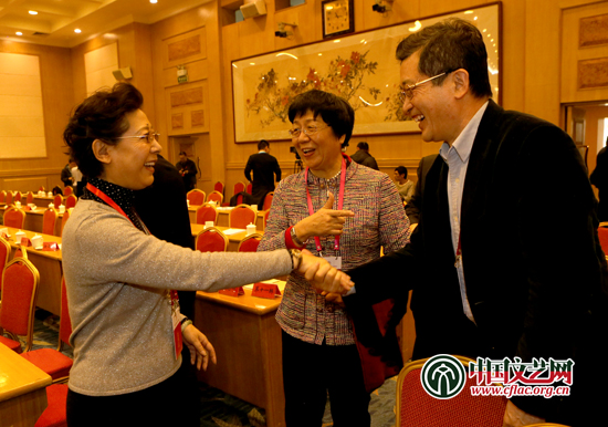 会议间隙,关牧村和委员们交流 中国文艺网 孟祥宁 摄