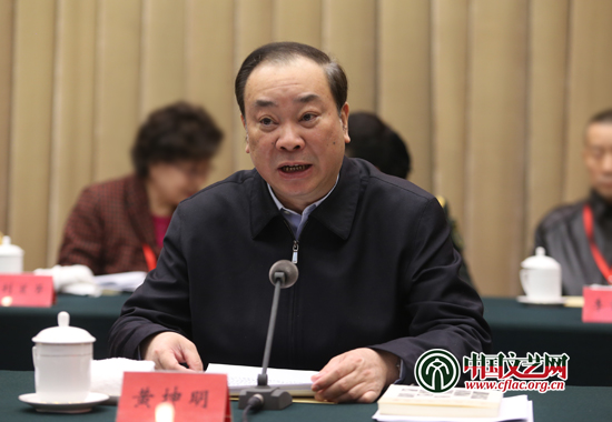 1月23日,中国文联九届七次全委会第一次全体会议在京召开。图为中宣部常务副部长、中央文明办主任黄坤明讲话。中国文艺网 孟祥宁 摄