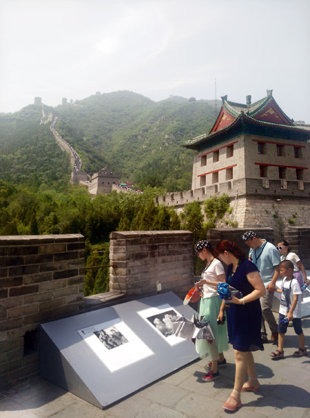 蜿蜒起伏的长城上,近百张抗战时期的老照片,吸引了众多游客驻足围观。
