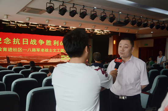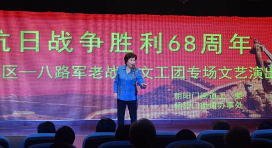 为大力弘扬爱国主义,9月3日下午八路军老战士文工团一行40余人,专程前往北京市东城区朝阳门街道办事处举行了——庆祝抗战胜利68周年爱国教育进社区专场文艺演出。中央国家机关老领导、八路军老战士文工团常务顾问:原全国大常委、中央文献研究室主任逄先知同志,原中共中央委员、中央宣传部部长王忍之同志,中国文联原副主席、书记处书记胡珍同志。还有名誉顾问王利军同志、中国文联副主席刘兰芳同志,焦歌团长,及北京市有关方面负责同志邵丽红、陈大鹏等出席观看了演出。
