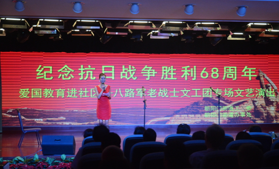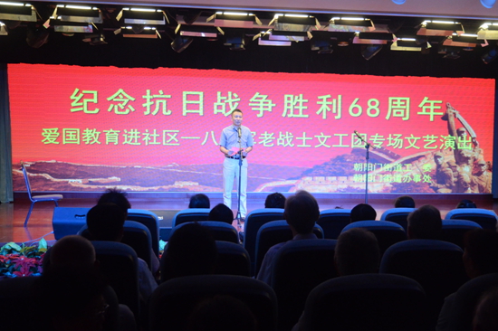 演出开始前,大屏幕播放了八路军老战士文工团摄制的专题片《爱国大业》。之后,团长焦歌发表讲话,他说:国共合作时期,于1937年8月,在国民党的一次高级会议上,宣布八路军正式成立。抗曰战争中,在中国共产党的领导下,八路军、新四军和各族人民英勇抗击倭寇,给侵略者以沉重打击,为抗战的胜利做出了重大贡献。八路军的平型关大捷和百团大战,对抗日战争的全面胜利起到了至关重要的作用。今天,世界政治格局变幻莫测,日本右翼势力又在蠢蠢欲动。我们今天走进社区举行庆祝纪念抗战胜利68周年文艺演出,就是为了让大家记住这段历史,每一名中华儿女都要居安思危,要深刻地意识到爱国教育刻不容缓。要时刻准备着听从祖国的召唤,听命党的指挥!为实现伟大的中国梦多做贡献!