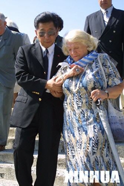9月8日,中国驻波兰大使苑桂森(左)搀扶着马伊达内克集中营幸存者瓦莱茨卡女士,一起观看纪念中国抗日战争胜利60周年图片展。
