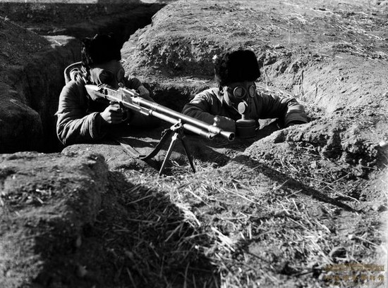 绥远前线严阵以待的士兵,为抵抗日军毒气弹,他们都戴着防毒面具