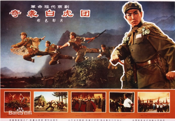 现代京剧《奇袭白虎团》是根据中国人民志愿军侦察兵副排长杨育才在金城战役中的英雄事迹编写,1955年进行首演,参加了1964年的现代戏曲汇演。文革时期被确定为八部革命样板戏之一。1972年被摄制成电影艺术片。