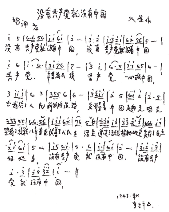 1943年,曹火星创作的《没有共产党就没有中国》手稿
