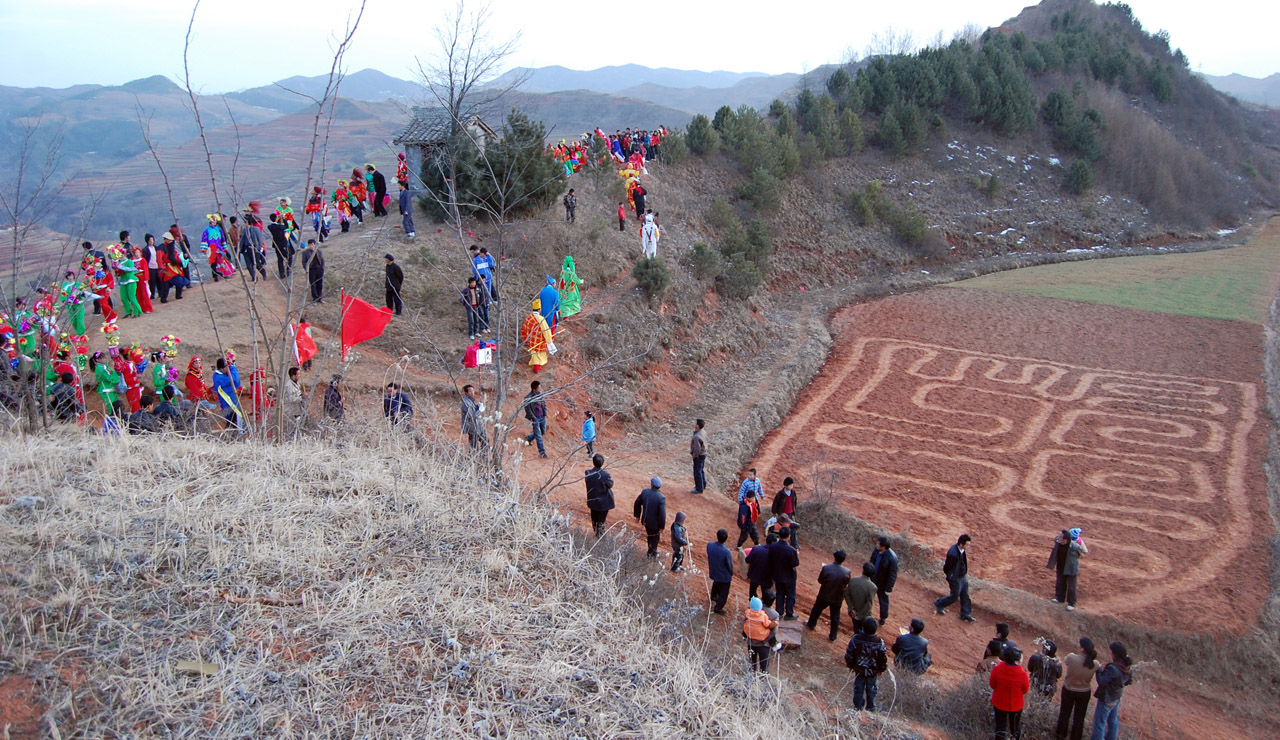 “走印”即是在打麦场地或田间地头走一个撰写的印章。除了表达祥和祝福的意思外,更重要的是具有“扶正祛邪”的作用。因为是用脚印在麦场走字,演员们怎样入场,入场后走几步转弯,怎样出场都有严格的要求与讲究。掌握这一技巧的是“灯头”。“灯头”是走在舞队前面带头的人。