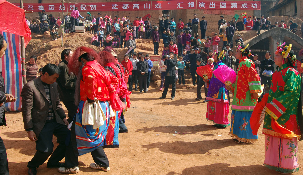当丰富多彩的社火表演,酣畅淋漓的羊皮鼓舞,原始神秘的“打傩雩祭”、“大身子”舞与传情达意的武都民歌,独具特色的把式歌舞等民间文化如咕咕的溪水在陇南武都这个贫瘠地方漫延、流淌、融合时,武都高山戏却如武都那绵延数千里的白龙江水般,在群山的怀抱里与树木的簇拥中,有始无终地接纳、吸收、融化着这些文化的丝丝甘甜。