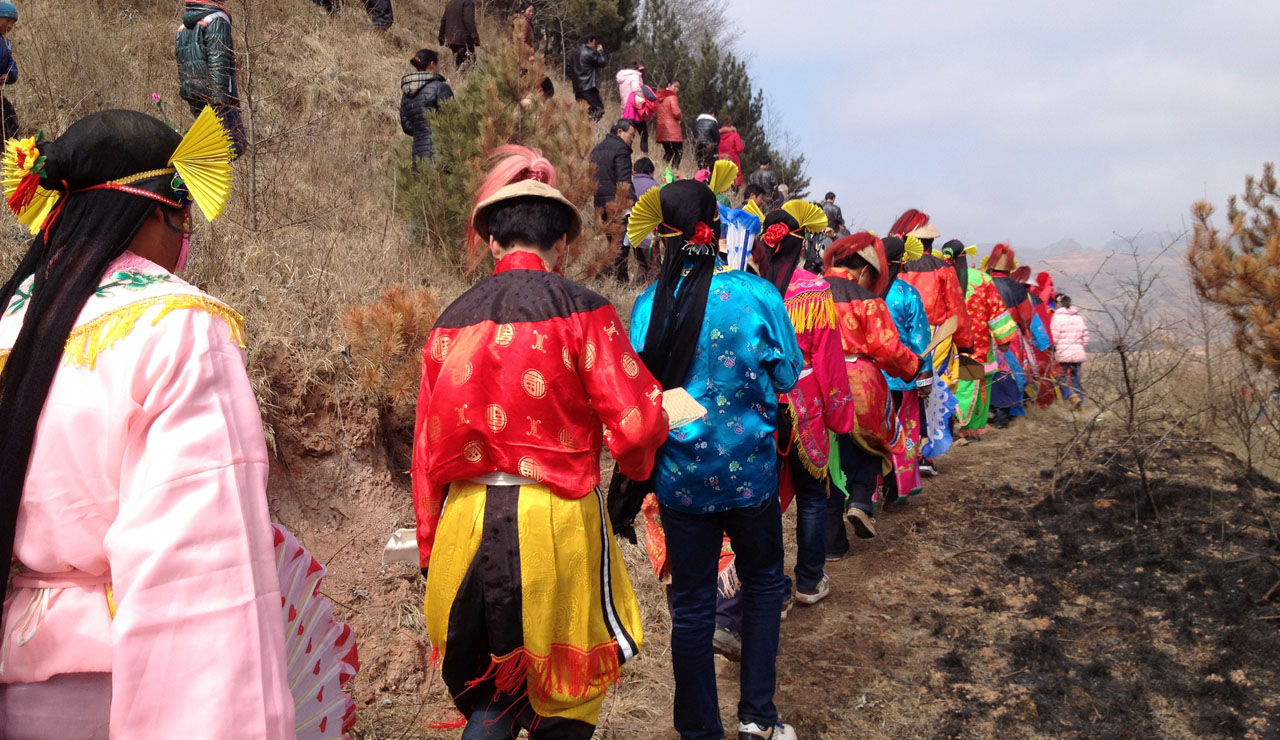 戏是给神演的,所以上庙拜神必不可少。上庙时,头人们走在前面,他们集体跪拜、上香、焚纸,告知神灵唱戏缘由与目的后,把式舞队中的头把式、头旦,二把式、二旦,三把式、三旦就在鼓乐声中跳“凤凰三点头”,然后跪拜、做揖、焚香。场面庄重威严。
