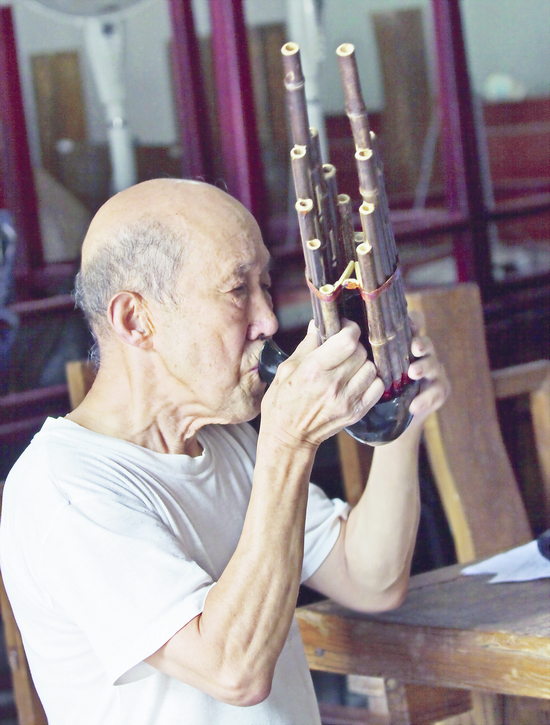 吹笙的张文斌今年76岁,是社里最年长的社员