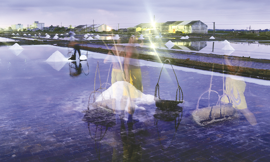 采海盐的基本原理:把海水灌到盐田,经过一个白天的太阳暴晒蒸发,剩下的就是结晶体的盐,再把结晶的盐刮成一堆后担走入库,做下一个精制环节。担盐是高强度的体力活,是制盐各环节里最辛苦的,也无法用机器代替,由于天气和生产技术落后等原因,生产海盐人工成本高,利润薄,盐场连年收成不好,连年处于亏损状态。职工平均月收入不足一千元,盐场还经常打白条。