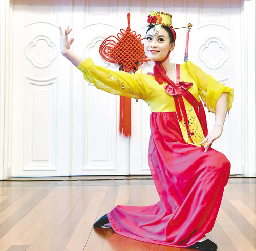 葡萄牙里斯本,中国留学生在中国驻葡大使馆举行的春节联欢晚会上表演舞蹈《阿里郎》。张立云 摄