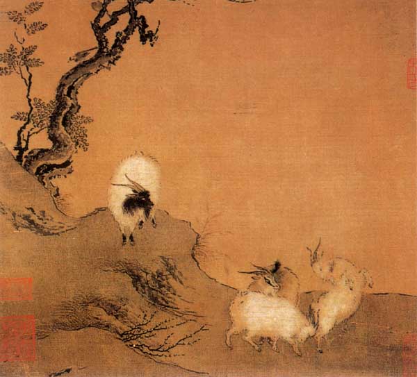 “四羊图”的绘者是南宋宁宗时的画院待诏陈居中,他擅长人物、蕃马,传世作品有《文姬归汉图》、《胡笳十八拍》等。宋代画家题材广泛,风格多样,注意观察生活,善于塑造生动形象、画风谨严、多现实主义表现手法,这在陈居中的“四羊图”中也体现了出来。“四羊图”中的羊无疑是画面的主体,羊的形象十分逼真,姿态也很生动,细部描绘十分讲究。不知你注意了没有,在山坡的大树上,还有两只禽鸟哩。[1]