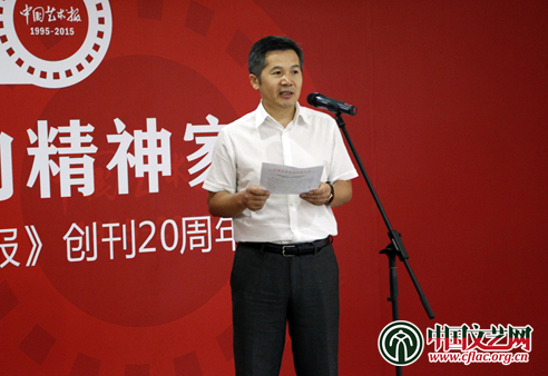 7月17日,庆祝《中国艺术报》创刊20周年展览在中国文艺家之家开幕。中国艺术报社副社长朱虹子宣读中国文联党组贺词。中国文艺网 高晴 摄