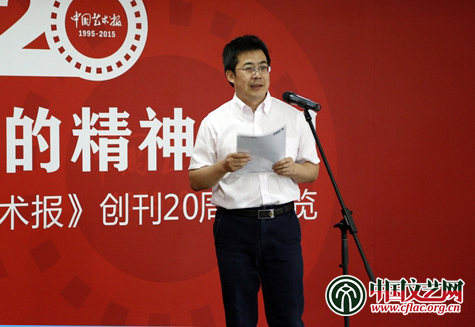 7月17日,庆祝《中国艺术报》创刊20周年展览在中国文艺家之家开幕。中国艺术报社副总编辑余宁宣读部分艺术家贺信。中国文艺网 高晴摄
