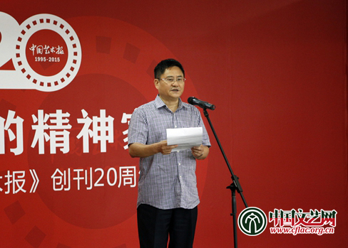 7月17日,庆祝《中国艺术报》创刊20周年展览在中国文艺家之家开幕。中国艺术报社社长向云驹介绍报社20年成就。中国文艺网 高晴 摄