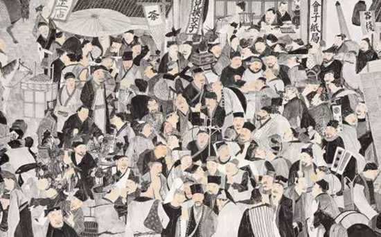 《宋代交子与纸币发行》的整个创作过程,对周京新来讲,就是深入到传统和历史之中,深入到具体生活的缝隙之中,扎根人民,在积累和解决问题的过程中获得了突破。周京新说,很多同行的朋友说我们画的这种感觉不一样了,有不同了,我觉得这就是创新。创新都是有渊源、有道理的,不能随便乱创、不能把自己胡来,或者不到位的一些做法,就当成是创新,不能说只要跟以前不一样了就是创新。习总书记说既要像小鸟一样在每个枝丫上跳跃鸣叫,也要像雄鹰一样从高空翱翔俯视。我觉得这就像画画的空间关系处理一样,在《宋代交子与纸币发行》中,既要有宋代的整体历史气息,又要有微观的、对每个人物眼神、服饰等细节的深入把握和了解。我觉得在我们的创作中,总书记说的很多精彩论断,用在我们绘画理论上,都是相通的,宏观的非常到位,微观的非常精准。周京新说,大道理都是相通的,正大的道理、堂堂正正宏观的大道理都是和微观相通的,习总书记的讲话,和文艺家具体在做的工作、创作都是相通的,一点都没有隔阂,是对文艺家最大的促进和鞭策。