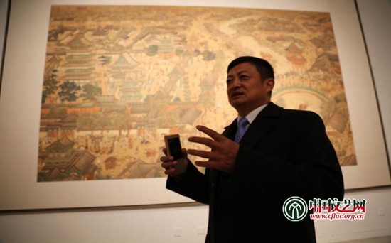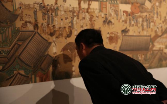 在“中华史诗美术大展”的一角,乌鲁木齐文联主席、乌鲁木齐作协主席熊红久在《汴梁繁盛图》前驻足了好久,他细细地端详画面的每一处细节、每一个人物的表情。他说,这幅作品很吸引人,因为它很好地掌握了大与小的分寸。“大”的是北宋首都汴京,那时的开封人口有一百万人,在宋代,这个规模的城市,可谓能够代表人类文明。可偏偏这样的大都会,却需要很多很多具体、生动的人来组成,只有细节画好了,才可能让整个繁华的“大”城市立起来。