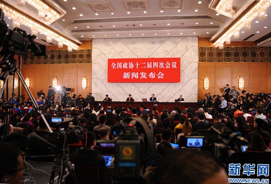 3月2日,全国政协十二届四次会议新闻发布会在人民大会堂一层新闻发布厅举行。图为新闻发布会现场。新华网/中国政府网 陈杰 摄