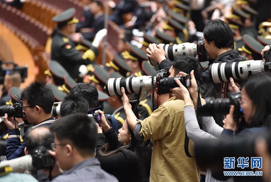 3月14日,全国政协十二届四次会议在北京人民大会堂举行闭幕会。这是媒体记者在会场采访拍摄。 新华社记者 李贺 摄
