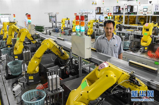 这是广东省东莞市松山湖长盈精密技术有限公司“无人工厂”的打磨机器手(2015年5月13日摄)。该车间完成“机器换人”改造后,作业人员从650人精简至30人,打磨效率提升2.5倍。当时间的指针指向又一个五年开局,全面建成小康社会迈入决胜阶段。 2016年全国两会召开在即。国家的宏伟愿景,人民的小康期盼,交响于3月的北京。未来五年,中华民族将穿越萦绕千年的小康梦想。站在新的历史起点,一幅亿万人民勠力同心、奋力迈向新征程的壮丽图景即将展开。 新华社记者 刘大伟 摄