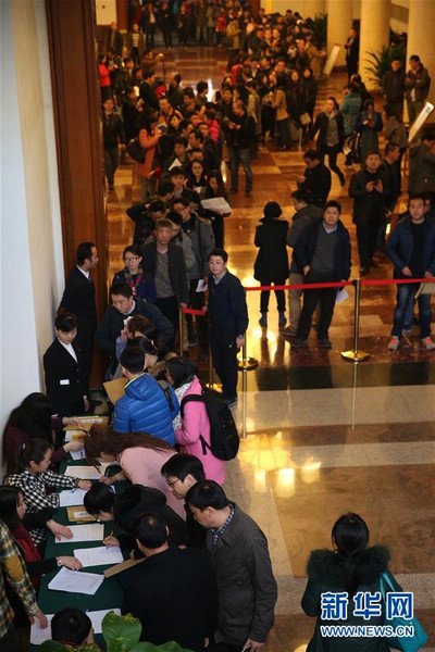 3月1日,记者们在全国政协礼堂排队领取证件。当日下午,全国政协十二届四次会议内地记者情况通报会在全国政协礼堂召开。会后,参加全国政协十二届四次会议采访报道的记者领取证件。新华社记者 金立旺 摄