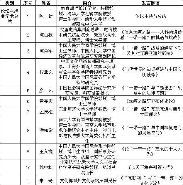 邀请“一带一路”研究知名学者、国际战略与历史文化知名学者、跨文化交流领域知名学者以及相关企业负责人等,就“一带一路”战略背景下如何做好跨经济贸易、社会、文化、民心等各领域的互联互通,如何与沿线国家和民族建立可持续良好关系,更好地实现总体战略目标,打造利益共同体、命运共同体和责任共同体等问题,展开深度探讨。