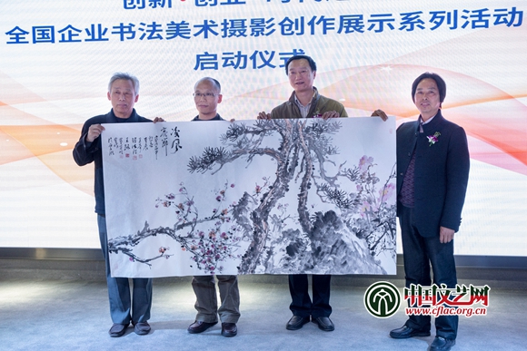启动仪式上,中国美术学院客座教授、河北美术学院终身教授王奇(左一)、中国金融美术家协会副主席黄东明(左二)、中国冶金美术家协会副主席王琳(右二)、中国艺术创作院创作员张法汀展示集体创作作品 姚炜 摄