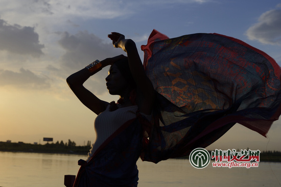 夕阳中,一位模特站在黄河岸边,她的纱巾被河风吹起。 卢北峰 摄