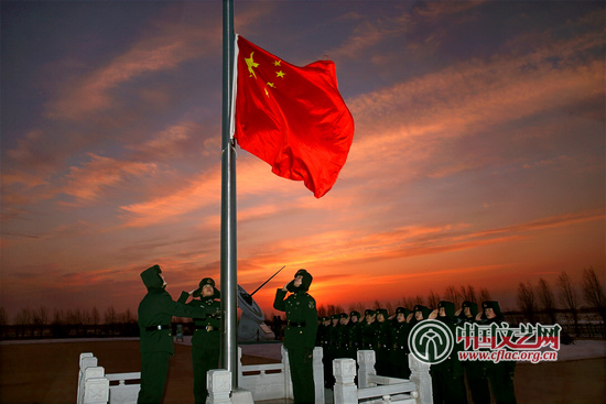 连队迎着初升的太阳举行升国旗仪式。(2016年2月)。 穆可双 摄