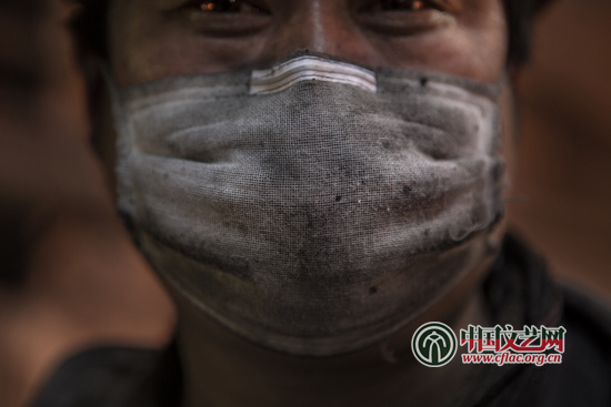 铸管车间一位职工的脸上、口罩上布满粉尘。 潘永强 摄