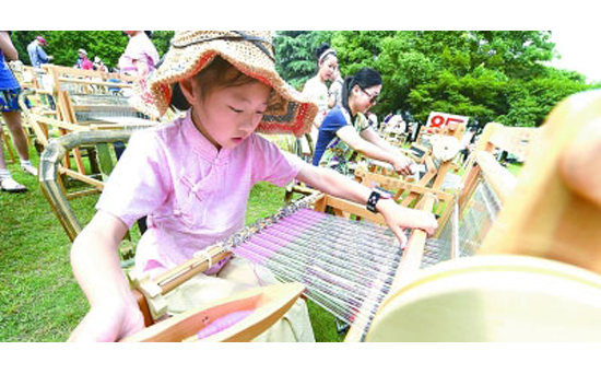 6月4日,杭州举办非遗传统技艺展示体验活动,许多市民前来参与。图为一名小市民在西湖边摆开的100架手工织机上体验传统土布织造技艺。