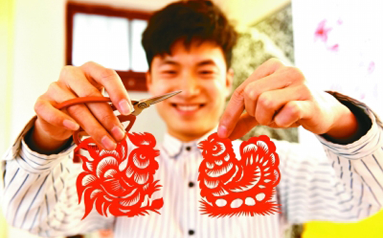 河南洛阳市剪纸非遗传承人、90后的畅杨杨向人们展示他创作的“鸡”主题的剪纸作品。