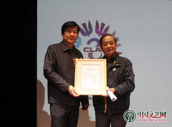 中国文联党组书记、副主席李屹向韩美林颁发荣誉证书。