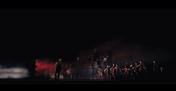 “生生死死”一场的灵感来源于达利的一幅画。“演员手里捏一根红绸则像是一滴血,血脉相通连接所有人的生死。”——信念一以贯之,战士的“生死”此起彼伏。衬托出生的沧桑和死的幸福。而最后一场戏“万物有灵”,表现着“灵魂战士”的不屈和永生。那蒙眼的纱布、颤栗的鲜花、孤独的拐杖……是每一位牺牲者的遗存,唯一剩下的女战士带着所有人的灵魂和信念庄严宣告:“我们到了”!