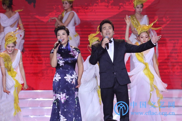 1月20日,“百花迎春——中国文学艺术界2018春节大联欢”在北京国家会议中心举行。图为张也、佟铁鑫演唱歌曲《亲爱的中国》。中国文艺网 高晴 摄