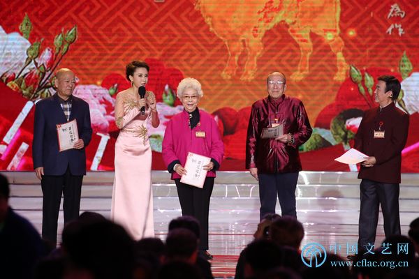 1月20日,“百花迎春——中国文学艺术界春节大联欢”在北京国家会议中心举行。田华、王铁成、雷恪生、田连元表演三句半《盛世芬芳》 中国文艺网 高晴 摄