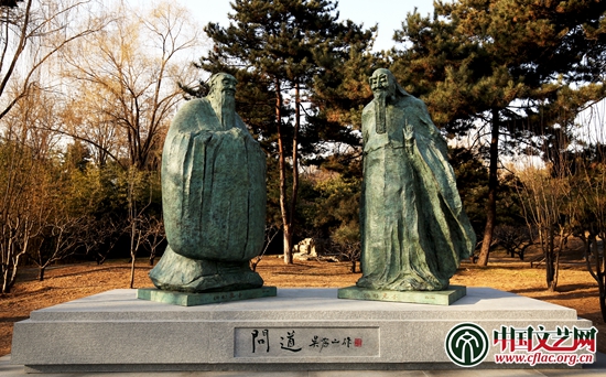 《问道》由青铜铸造的孔子和老子两尊雕像组成,取自《史记·老子韩非列传》中所记载“孔子问道于老子”的典故,生动地表现了两位文化先贤晤面的历史瞬间。《问道》中的孔子像浑然高古,展现出儒家仁爱为本的道德追求;老子像则飘逸悠游,强调线的表现,体现了道家道法自然的精神内核。