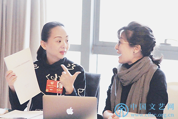 组图为邰丽华(左)在全国政协十三届一次会议小组讨论会上发言。