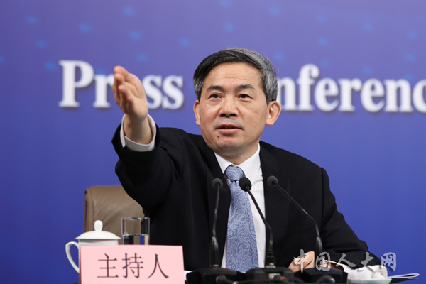 3月6日上午,十三届全国人大一次会议在梅地亚中心举行记者会,国家发改委主任何立峰、副主任张勇、副主任宁吉喆就“创新和完善宏观调控,推动高质量发展”的相关问题回答中外记者的提问。图为十三届全国人大一次会议新闻中心主任、主持人 何绍仁。中国人大网 罗荣 摄