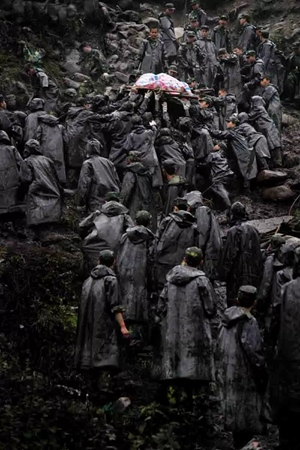 2008年,“5.12”汶川特大地震救援中,空军官兵用身体搭建人梯,抢运和输送银厂沟灾区受困群众和伤员。 刘应华 摄(选自:四川省文联庆祝改革开放40周年文艺特展)