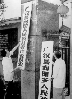 1980年6月18日,广汉县向阳人民公社在全国率先“摘掉”人民公社牌子,正式换上了向阳乡人民政府的牌子。 郑国斌 摄(选自:四川省文联庆祝改革开放40周年文艺特展)