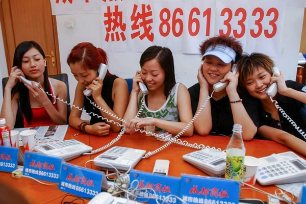 2006年6月,第二届“超女”李宇春、张靓颖、何洁、冯家妹、文瑶在成都媒体接听热线电话。 迟阿娟 摄(选自:四川省文联庆祝改革开放40周年文艺特展)