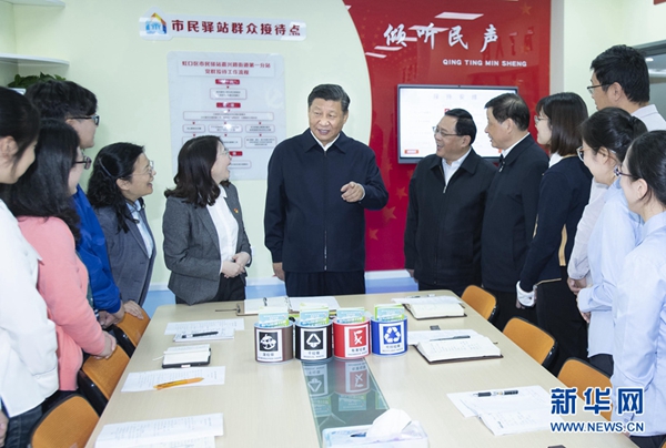 上海虹口区人口密度大。为满足居民社区生活各方面需求,虹口区设置了35个市民驿站,努力打造“15分钟社区生活服务圈”。习近平走进虹口区市民驿站嘉兴路街道第一分站,逐一察看综合服务窗口、托老所、党建工作站等。托老所内,几位老年居民正在制作手工艺品,总书记亲切向他们问好,老人们激动地握着总书记的手,向总书记讲述自己的幸福晚年。习近平指出,我国已经进入老龄社会,让老年人老有所养、生活幸福、健康长寿是我们的共同愿望。党中央高度重视养老服务工作,要把政策落实到位,惠及更多老年人。市民驿站里,来自居委会、企业的几位年轻人正在交流社区推广垃圾分类的做法。习近平十分感兴趣,仔细询问有关情况。一位年轻人介绍说公益活动已经成为新时尚。习近平强调,垃圾分类工作就是新时尚!垃圾综合处理需要全民参与,上海要把这项工作抓紧抓实办好。习近平叮嘱他们,城市治理的“最后一公里”就在社区。社区是党委和政府联系群众、服务群众的神经末梢,要及时感知社区居民的操心事、烦心事、揪心事,一件一件加以解决。老百姓心里有杆秤。我们把老百姓放在心中,老百姓才会把我们放在心中。加强社区治理,既要发挥基层党组织的领导作用,也要发挥居民自治功能,把社区居民积极性、主动性调动起来,做到人人参与、人人负责、人人奉献、人人共享。临别时,闻讯赶来的居民簇拥在总书记身边,争相同总书记握手。