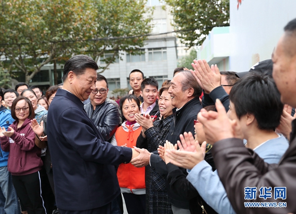 这是习近平在虹口区市民驿站嘉兴路街道第一分站托老所同老年居民亲切握手。 新华社记者 谢环驰 摄
