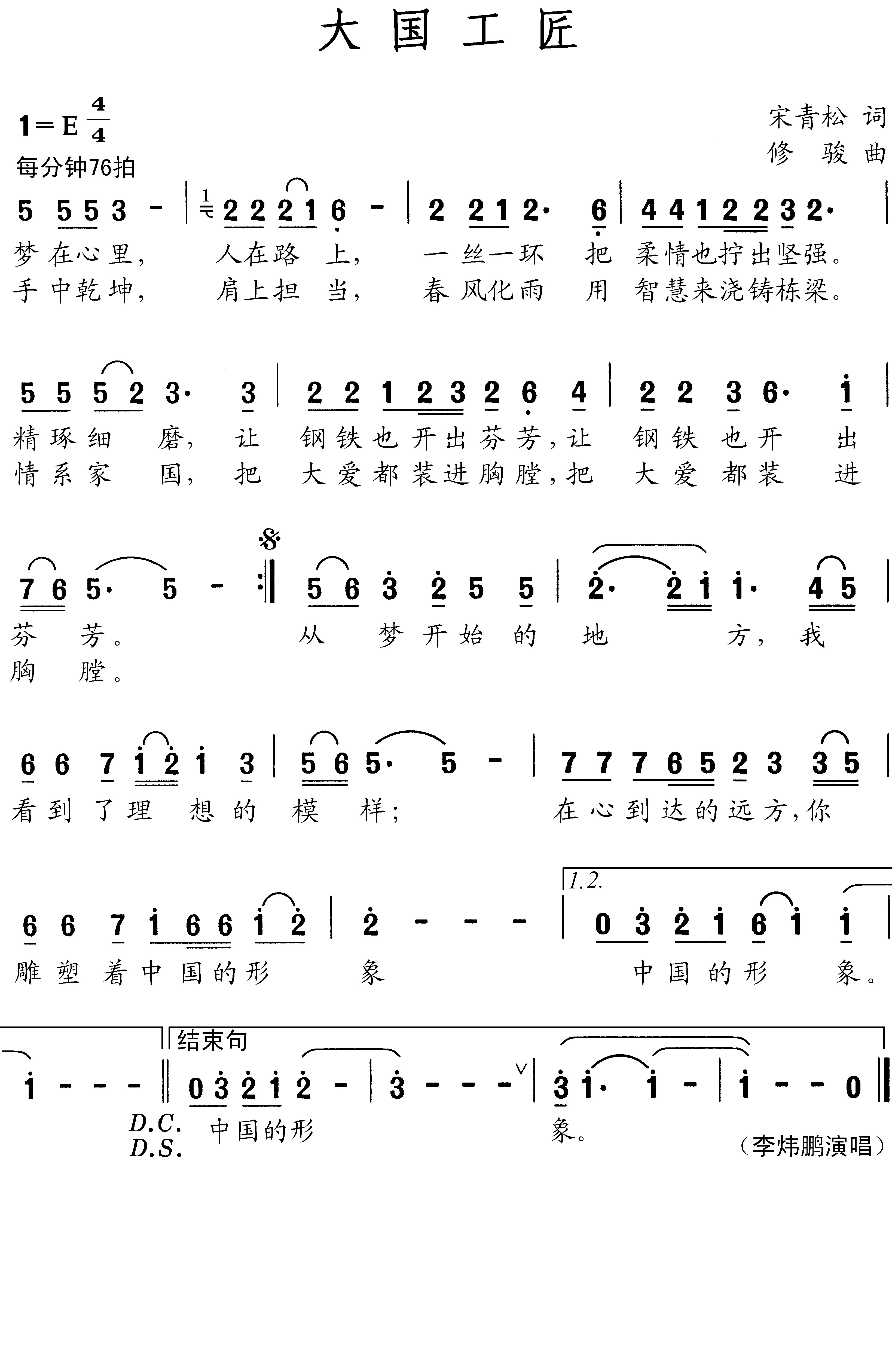 用音乐塑造当代职工形象,一直是我们追求的目标。这首作品没有拘泥于具体工种的描述,而是紧扣工匠精神的灵魂,努力开掘他们的人文情怀。两段开头分别用“梦在心里、人在路上”,“手中乾坤、肩上担当。”为引子高度概括大工匠的追求精神和责任意识。每段分别用“一丝一环、把柔情也拧成坚强,精琢细磨、让钢铁也开出芬芳。”“春风化雨、用智慧来浇铸栋梁,情系家国、把大爱都装进胸膛。”四个形象来分别表达敬业严谨、专注精益、创新拼搏、博爱奉献的工匠精神。副歌用“我看到了理想的模样……你雕塑着中国的形象。”升华了歌曲的主题。歌曲音乐时尚大气、精练别致、生动感人,且易学易唱。A段以内敛、叙述的旋律娓娓道来,展现了工匠们凝神聚力、追求极致的职业品质;B段(副歌)通过音乐主题的扩展,气势磅礴地展现了大国工匠新时代的精神风貌和伟岸形象!
