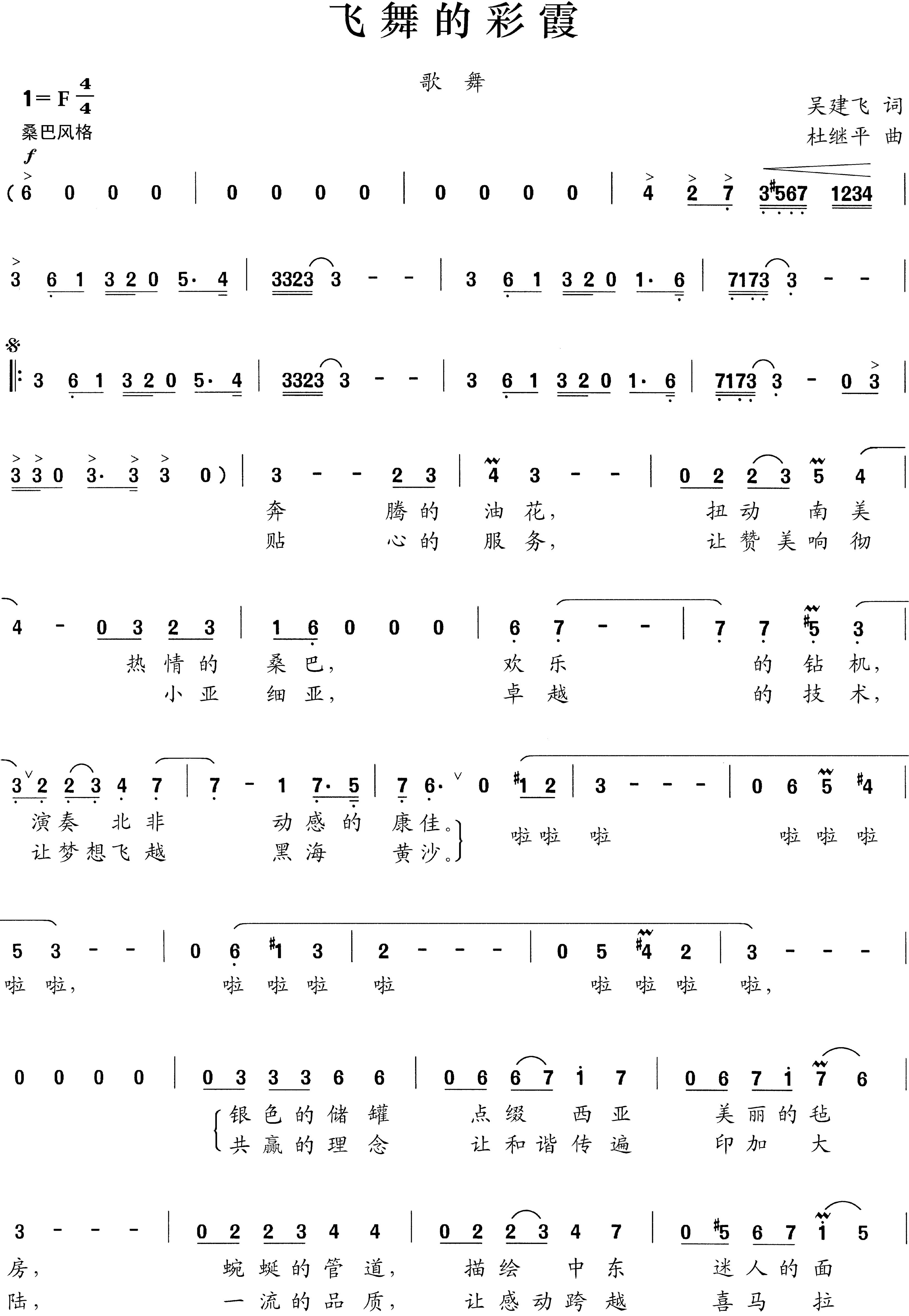 歌曲《飞舞的彩霞》以弘扬“中国梦”为主题,以国家“一带一路”重点建设工程为背景,以国际能源工程市场为素材,热情赞美了奋战在南美、北非、西亚、中东等丝绸之路上的产业工人打造世界一流企业的“中国精神”,歌颂了丝绸之路上中国与世界各国的亲密合作以及取得的巨大成果。