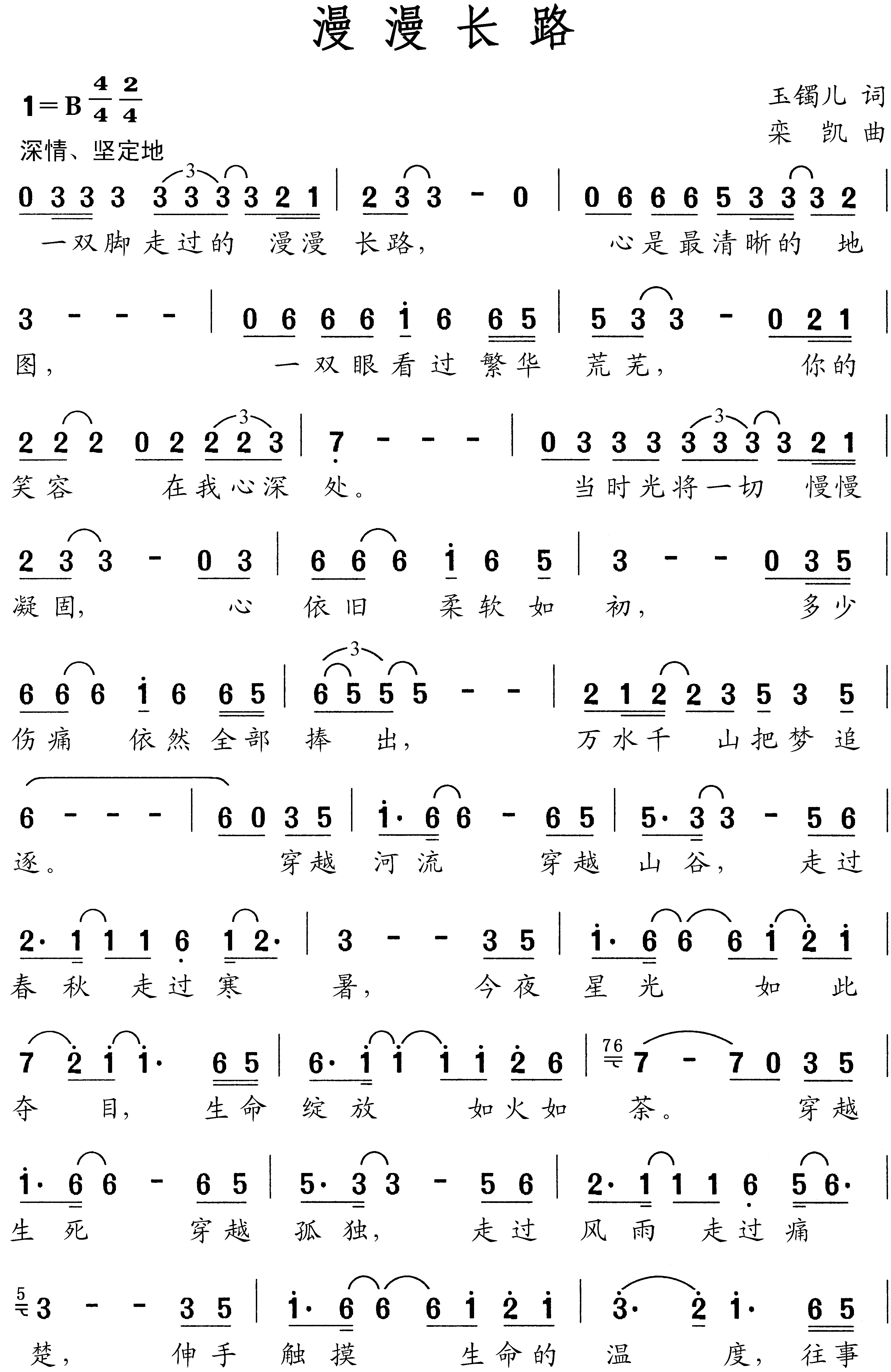 歌曲《漫漫长路》是一首跟以往写长征的角度都不一样的歌曲,没有写到草根、八角帽、二万五千里路程等词句,而是从理想信念和人性光辉的角度入手,描写人类历史上这一伟大的征程。歌词的语言简练、内涵丰富而有着巨大张力,旋律优美动人,是主旋律歌曲中较为少见的流行风格作品。歌曲从创作到录制,歌词创作几易其稿,旋律反复打磨,歌手黄琦珊的演唱入情入心,唱功和细节处理老道,一贯的黄氏唱腔爆发力很强。